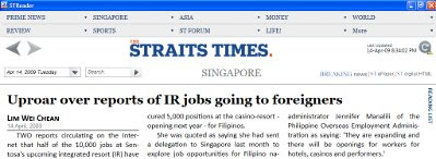 Anyway, the title didn't seem to satisfy some people, and it was changed yet again to "Buzz Over Resort Jobs". I was just checking the STReader, and the title is now "Uproar over reports of IR jobs going to foreigners". I think this is a reasonable headline. At the very least, it isn't factually wrong!